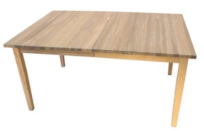 Massief beuken of eiken eettafel, te verlengen met max. 2 aanzetbladen a 50 cm.